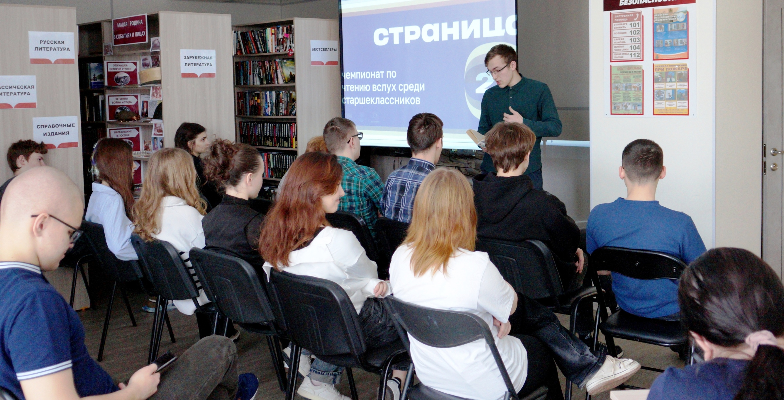 В модельной сельской библиотеке п.Новостройка прошёл отборочный тур Чемпионата по чтению вслух «Страница’26», организованный совместно со школой. Это мероприятие направлено на развитие и популяризацию культуры чтения среди старшеклассников. Оно помогает подросткам познакомиться с лучшими произведениями российской литературы в конкурсной форме. Участники читали отрывки из книг на время и без предварительной подготовки. Отборочный тур включил чтение научно-популярной литературы, отечественной прозы и поэзии. Ученики 10 класса продемонстрировали отличную технику чтения и артистизм. Финалисты Андреев Александр, Берестов Владислав, Кроль Григорий читали стихотворения С. Есенина. Победителем стал Андреев Александр.
