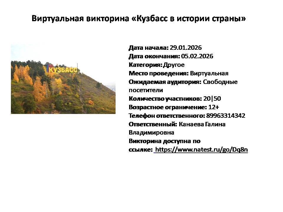 Модельная сельская библиотека п.Новостройка, Кемеровский муниципальный округ, п.Новостройка Виртуальная викторина"Кузбасс в истории страны"